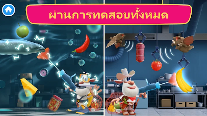 การเดินทางสู่การเป็นเชฟมืออาชีพใน Booba's Kitchen เต็มไปด้วยความท้าทายอันหลากหลายที่จะทดสอบความแม่นยำและความว่องไวของคุณ ไม่ว่าจะเป็นการสไลด์ผักผลไม้บนสายพานลำเลียงอย่างรวดเร็ว พร้อมหลีกเลี่ยงสิ่งแปลกปลอม หรือการสวมบทเป็นนินจาผลไม้ที่ต้องหั่นวัตถุดิบที่พุ่งเข้ามาพร้อมหลบระเบิดอย่างชาญฉลาด จากนั้นมาทุบก้อนน้ำแข็งเพื่อปลดปล่อยส่วนผสมลับ, ขูดวัตถุดิบที่ร่วงหล่นด้วยเครื่องขูดไฟฟ้า หรือเก็บเกี่ยวใบพืชอ่อนอย่างระมัดระวังเพื่อหลีกเลี่ยงเหล่าหนอนจอมป่วน แต่ละด่านจะทำให้คุณได้ฝึกฝนทักษะการเตรียมอาหารอย่างเข้มข้นและสนุกสนาน